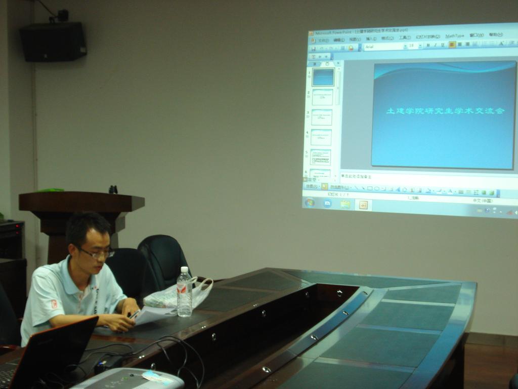 2011年11月3日19点,“拓新论坛”之土建学院研究生学术交流会在工科二号楼A502如期进行。会议邀请了研二以及研三的优秀研究生代表杨翠屏、张明、王文亭和侯攀,研一的大部分同学和少量本科生参加了此次交流会。