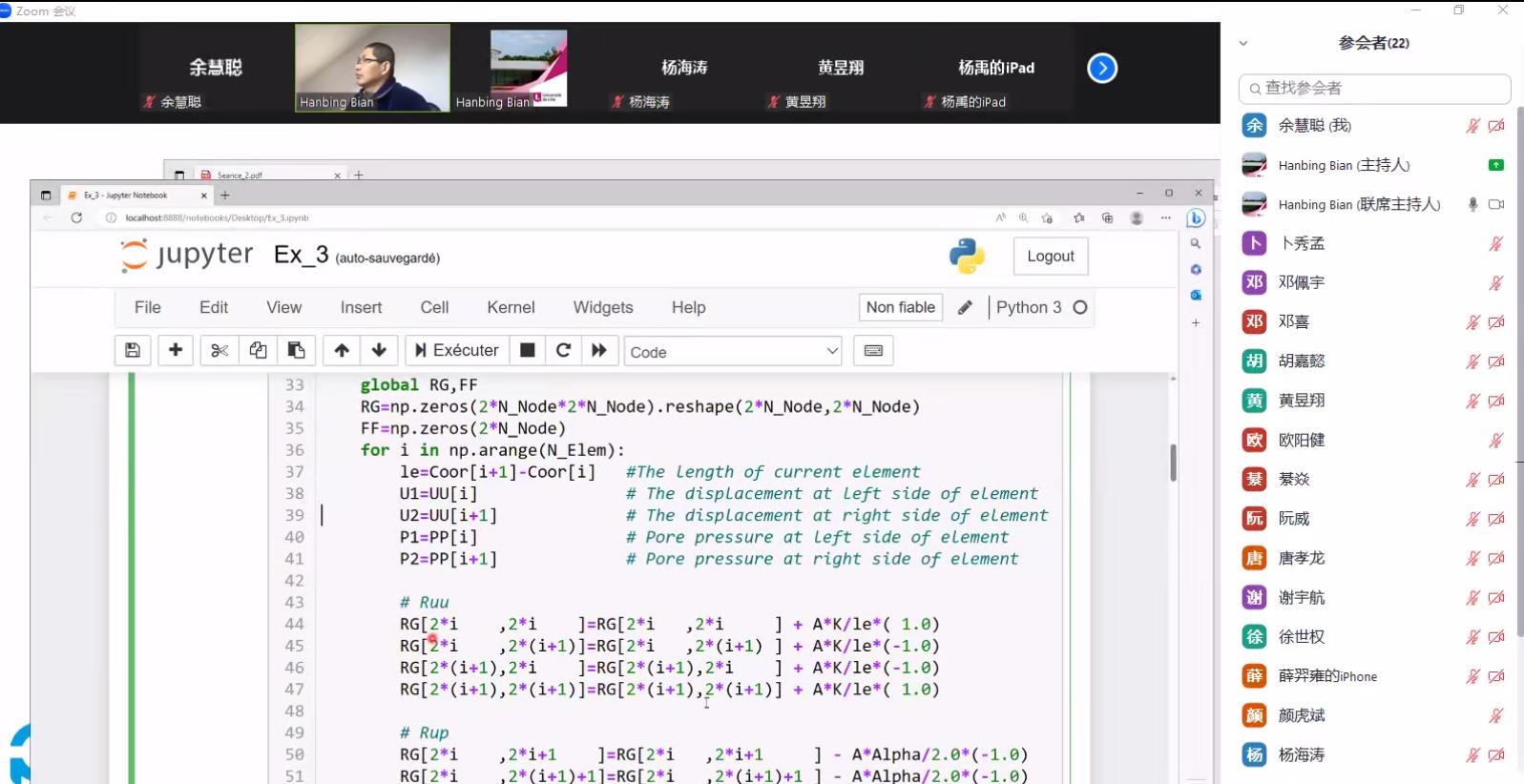 卞老师深入简出地为同学们讲解了孔隙介质力学的基本理论,并带着同学们进行软件实操,从软件介绍开始初步学习Python语言,在课程最后达到可以自主编写一维流固耦合模型的有限元程序,并单元网格划分、偏微分方程解求解与边界条件处理等问题有了深刻认识。卞老师在课程讲述过程中也多次与同学们互动,了解同学们的学习程度并及时答疑解惑,尽可能地让所有同学能学好孔隙介质力学课程。本课程内容丰富、气氛活跃,不仅开阔了同学们的科研视野,也促进了我院与国外知名学校的沟通与交流。