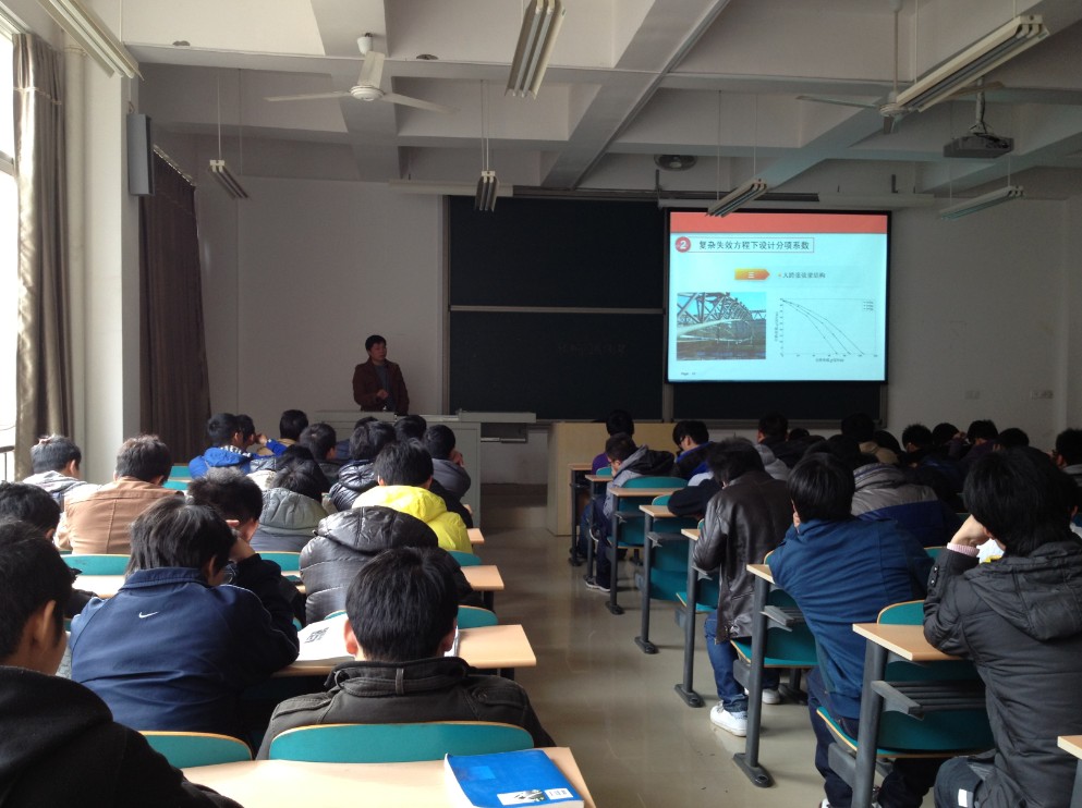 11月27日下午两点,蒋友宝副教授在工科三号楼A-208做客土建学院拓新论坛,为学生举办了《复杂结构失效方程模拟与可靠性设计》专题学术讲座,建筑工程2010、2011、2012级学生听取了报告。