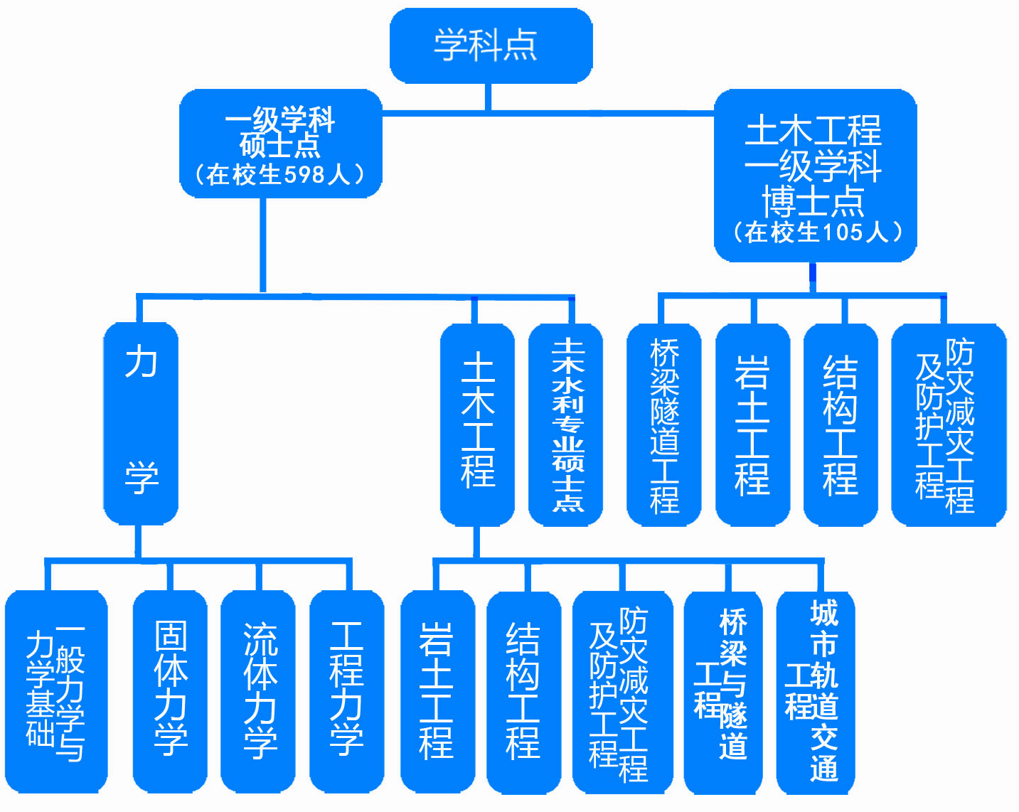 经多年发展积累,学院目前拥有“土木工程”博士后科研流动站、“土木工程”一级学科博士学位授权点、“土木工程”一级学科硕士学位授权点、“力学”一级学科硕士学位授权点、“土木水利”领域专业硕士学位授权点。
