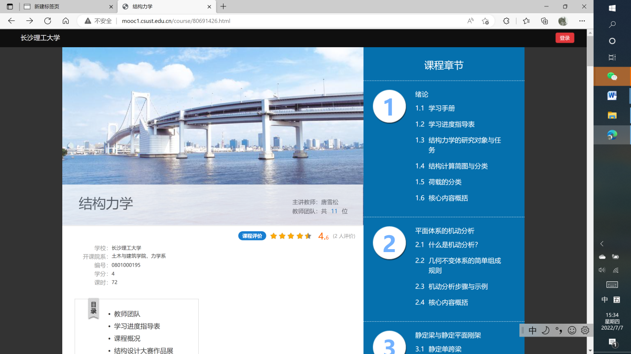 结构力学课程,2014年成为william威廉中文官网首门建成并投入使用的慕课课程,2018年成为门批湖南省精品在线开放课程。