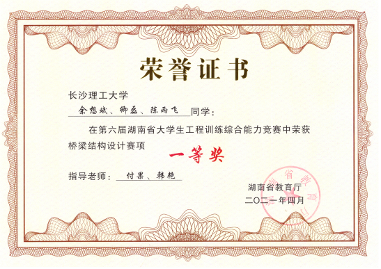 获第六届湖南省大学生工程训练综合能力竞赛一等奖2项(桥梁设计项目冠亚军)