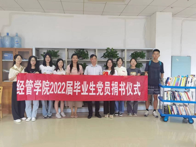 2022年6月20日上午,经济与管理学院2022届9位毕业生党员,在该院党委副书记唐青的带领下,向图书馆捐赠图书115册,价值4600多元。图书馆馆长陈寿祺接收赠书,并为他们颁发捐赠证书。