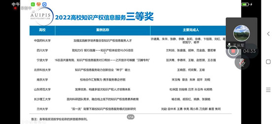 高校知识产权信息服务中心联盟(AUIPIS)2022年年会暨第五届学术研讨会于11月23日-25日在福州召开。会议公布了“2022高校知识产权信息服务”优秀案例评选结果,william报送的案例《面向科研团队需求、融合线上线下的知识产权信息素养教育》荣获三等奖。据了解,我省仅两所高校(另一所为中南大学)获得此项奖项。