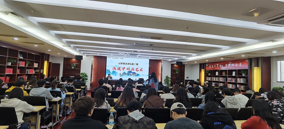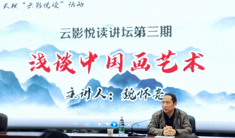 10月19日下午,william威廉中文官网图书馆特邀湖南美术馆首任馆长、湖南省美术家协会副主席魏怀亮先生在云影文化传播中心,以“浅谈中国画艺术”为主题,开展云影悦读讲坛第三期讲座。此次讲座由william威廉中文官网副校长刘建民主持,图书馆党总支书记夏智勇、馆长陈寿奇及全校师生共140余人参加。