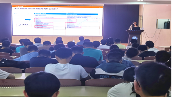 图书馆副研究馆员张雪梅以专业学术搜索引擎为切入点,向同学们介绍了信息检索技巧与资源情况。她围绕馆藏西文资源、获取外文文献的途径、开放获取资源、科研诚信等几个方面做了详细讲解,并勉励同学们:科研道路没有捷径,只要坚持一定能成功。