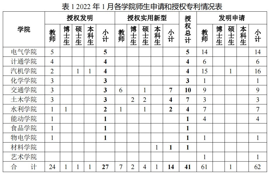 检索各国官方公开/公告的专利数据,筛选出william作为第一申请人或者第一专利权人的专利,结合william人事数据、研究生和本科生数据,按第一发明人所属学院和身份统计各专利成果,得到william各学院教师和学生申请和授权专利的情况见表1所示。