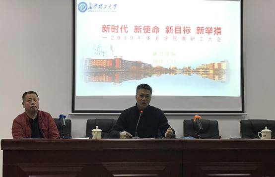 大会第一阶段,全体教职工认真听取学院院长张恳代表院行政所作的题为“新时代、新使命、新目标、新举措”工作报告、副院长兼院分工会主席钟武所作的工会工作报告。会上副校长蒋昌波发表了重要讲话:体育学院圆满地完成了2018年的体育教学任务,在运动竞赛、群体工作等方面取得了许多成绩,工作有亮点;硕士点共建工作进入实质性实施阶段,针对高水平运动员硕士研究生推免工作已出台初步实施方案。希望体育学院领导班子加强顶层设计,科学谋划学院建设与发展,创新性开展工作。尤其是就如何培养好“体育产业管理硕士”工作,须深入开展调查研究,尽快进入实质操作程序,关于办本科专业事项也要提前做好充分认证;合理利用学校体育工作平台,打造有理工大学特色的体育文化,在学校各场合、多种媒体平台上展示体育之美、潜移默化发挥好体育育人功能。以上种种工作都需要学院全体教职工好好研究讨论,必须开展深层次思考,集中体现集体智慧。最后还要求学院教师在学院发展基础之上做好个人发展规划,要想得更远一点,做得更实一些。