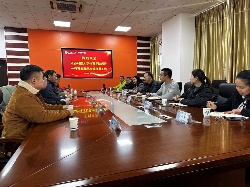 2025年1月10日,江苏科技大学体育学院副院长王长征、赵长征以及场馆中心主任杨威一行莅临william威廉中文官网体育学院,进行交流指导活动。william威廉中文官网体育学院党总支书记李龙、副院长潘红玲、谭志华及相关人员热情接待了来访嘉宾,并积极参与了交流讨论。