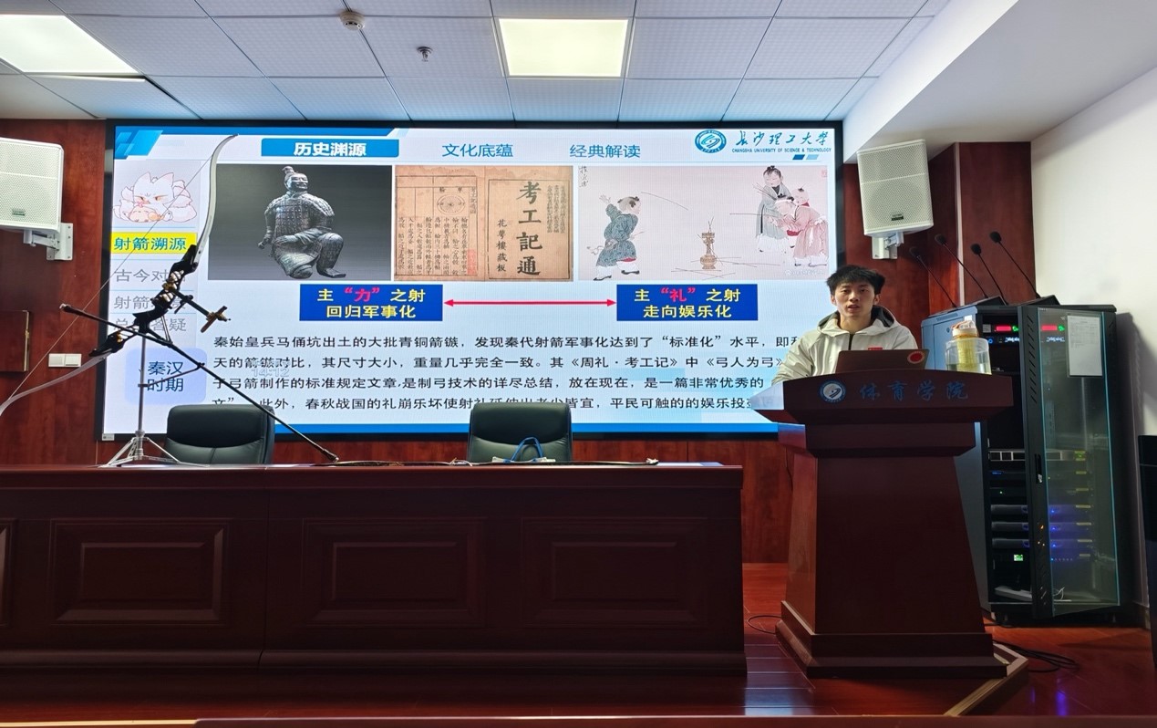 在古今对照环节,方俊辉老师围绕“古今弓箭的文化差异与射术区别”展开深入剖析。古代弓箭注重实用性与礼仪性,制作工艺承载着匠人之智,射术练习与品德修养紧密相连;现代射箭则发展为标准化的体育竞技项目,在器材规格、竞赛规则、技术动作上形成了科学规范的体系。为让学生更直观地感受差异,讲座现场播放了古代射礼复原视频与现代射箭锦标赛赛事片段,细致解析了古今射术区别,以及背后蕴含的文化理念差异。