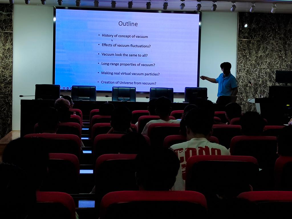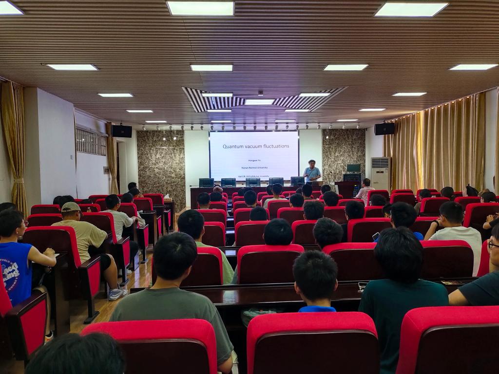 5月29日下午湖南师范大学余洪伟教授应邀来william理科楼B413作了一场题目为“Detecting acceleration-modified vacuum fluctuations (Unruh effect) with quantum entanglement”的学术报告。学院物理专业教师和研究生、本科生共一百余人现场聆听报告,副院长(主持工作)张卫兵主持报告会。