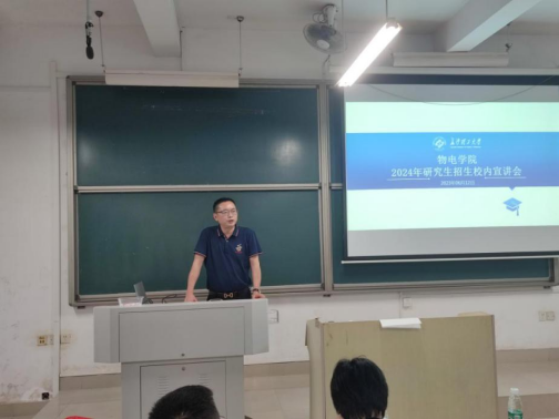 为做好2024年研究生招生宣传工作,使同学们更好地了解学院的研究生教育、招生政策与相关要求,2023年6月12日晚,2024年研究生招生校内宣讲会在工一B220举办。学院党委书记张国强、副院长(主持工作)张卫兵、副院长范志强、副院长刘斯、院党委委员鲁耿彪出席会议。同时邀请了应用物理系主任尹崇山、电子信息系副主任卞立安、吴丽娟副教授进行宣讲。会议由院党委副书记宋国宁主持,年级辅导员郭晨鑫和近200名2020级本科生参加了宣讲会。