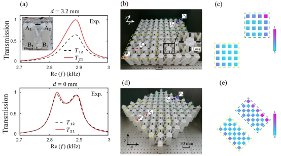 图1. 二维声子晶体中混合阶趋肤效应的实验观测。(a)损耗诱导的非互易传输观测。(b)正方形声子晶体样品。(c)正方形声子晶体中的角趋肤观测。(d)菱形声子晶体样品。(e)菱形声子晶体中的边界趋肤观测。