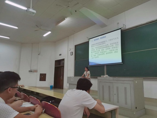 大会开始,李灵均副书记以当前国内外形势和行业发展趋势为切入点,鼓励大家充分发挥专业优势,积极投身国家建设,同学们深受鼓舞。蒋琳嫒老师就求职过程中的敲门砖——简历进行了讲解,指出了许多同学们在简历制作中出现的细节问题,并针对就业提出了3点建议,第一:匹配度高;第二:阐述个人经历时要抓住重点;第三:面试时,找出自己最强的三个技能,力图给面试官留下最好的印象。同时,两位老师希望同学们合理审视今年的考研情况,复习到位,做好考研志愿填报。