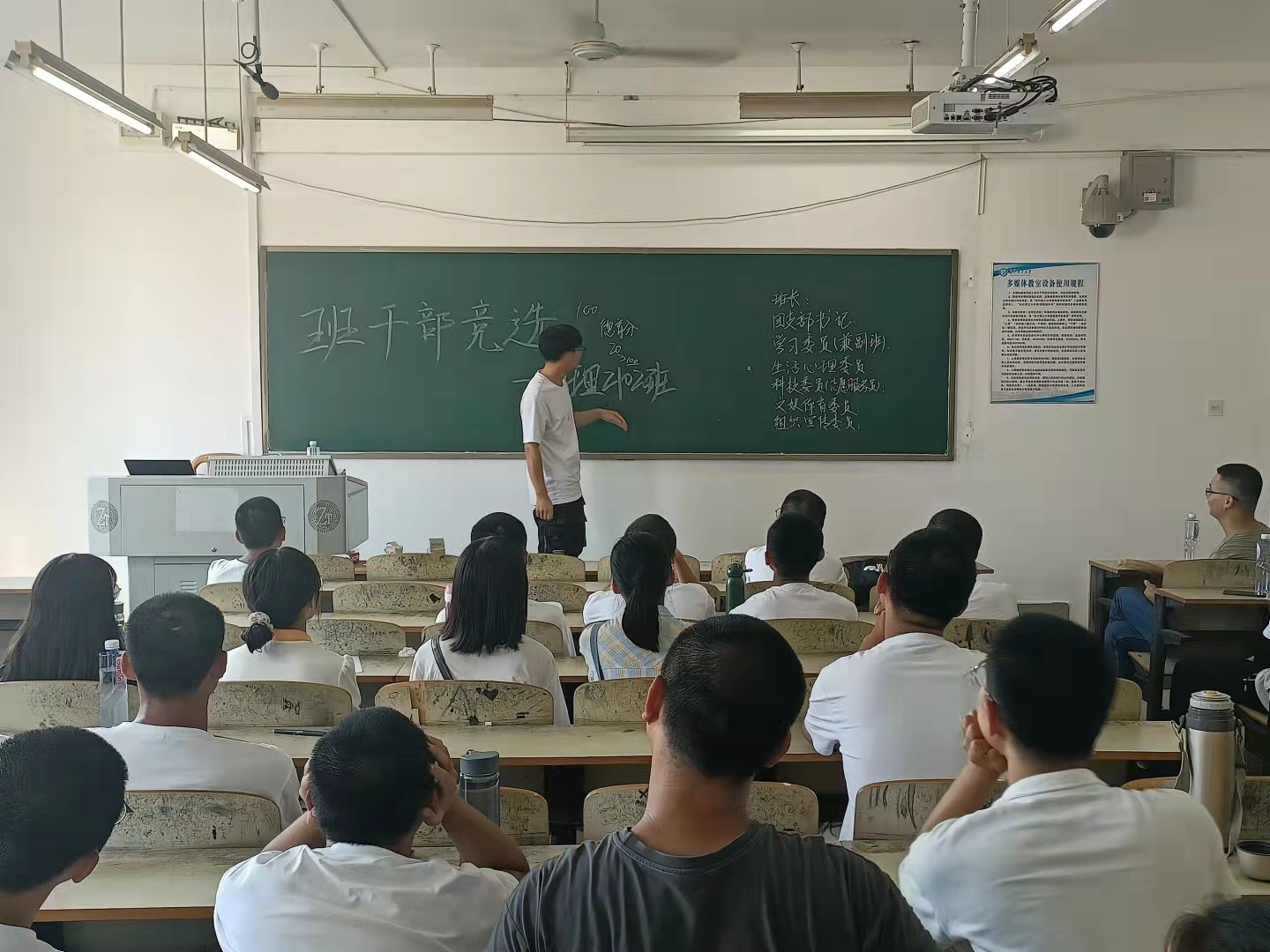 班会中,各班班助向大家讲解大学各个班干部的职责,作为班委应当具备的素质和责任感,让新生们对班委竞选工作的重要性有了新的认识。本次班会主要竞选职务为:班长、团支部书记、学习委员、生活心理委员、科技委员、文娱体育委员、组织宣传委员。在竞选中,许多同学牢牢把握住了这次机会,纷纷上台向大家展示自己的特长和优点,并说出自己对于所竞选职位的工作设想和目标,表示出自己愿意热心服务同学和认真仔细完成班委工作的决心,班委竞选人们的精彩演说更是获得同学们的阵阵掌声。
