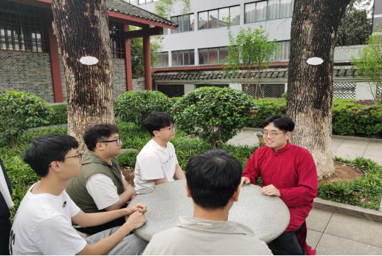 参观结束后,一场充满创意与深意的“穿越时空的对话”活动拉开帷幕。同学们换上长袍,穿梭在草木葱茏、庄严肃穆的旧址之中,仿佛真的跨越了时光,与当年的先辈们展开了一场心灵对话。他们围绕新民学会的历史意义、五四精神的内涵,以及在新时代如何传承和弘扬五四精神等话题,展开了热烈的讨论。大家各抒己见,从历史谈到现实,从个人理想谈到时代使命,现场气氛热烈而真挚。