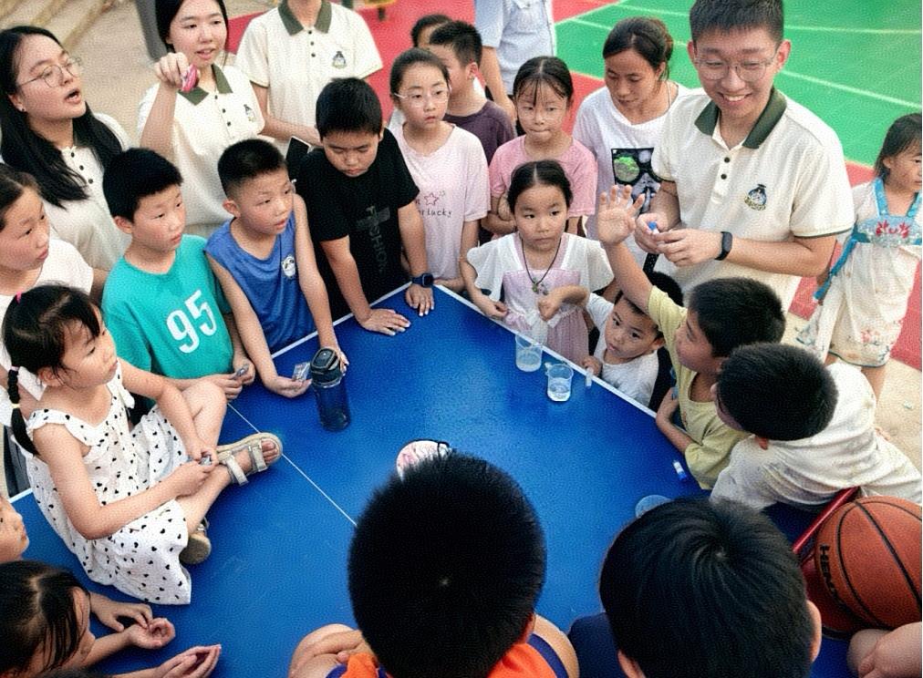 “哇!水变蓝了!像星星掉进瓶子里!”湖北省广水市关庙镇的广场上炸开一片欢呼。7月13日下午,william威廉中文官网物理与电子科学学院“小小科学家”科普志愿队带领当地的孩子们玩起了神奇的蓝眼泪实验。