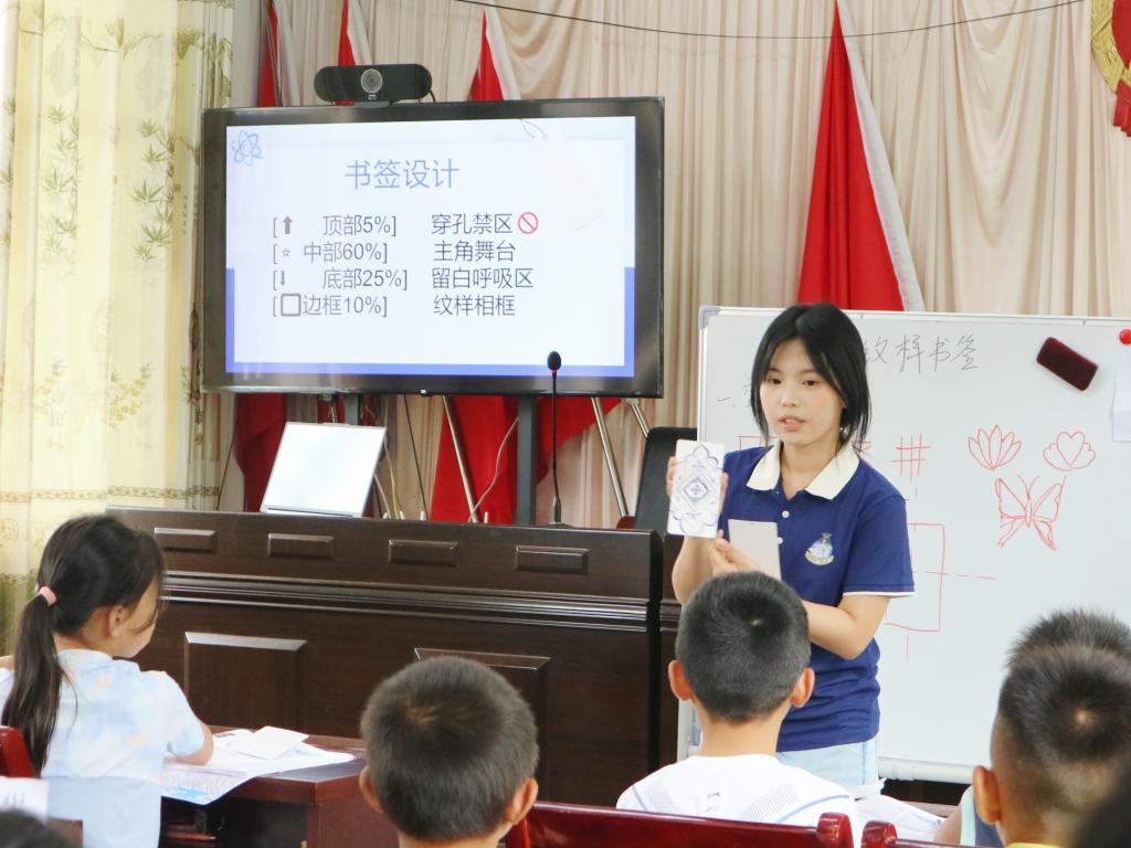 “八角纹真的是‘八方来财’吗?”“蝙蝠涂红会更喜庆吧!”7月18日,张家界市桑植县走马坪白族乡走马坪村支部教室,william威廉中文官网物理与电子科学学院“小小科学家”团队执笔引导乡村儿童将非遗白族纹样几何纹、花卉纹、动物纹“变”成书签,千年纹样就此跃入童真世界。