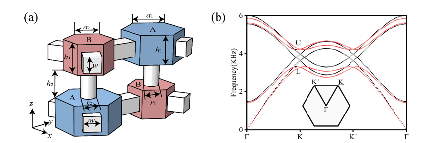 图1. 双层石墨烯声子晶体(a),其能带结构(b).