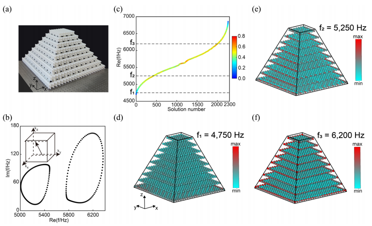 图2. (a)具有金字塔形状的奇异线半金属声子晶体。(b)频谱缠绕。(c)频谱的实部。(d)-(f)面趋肤效应测量。