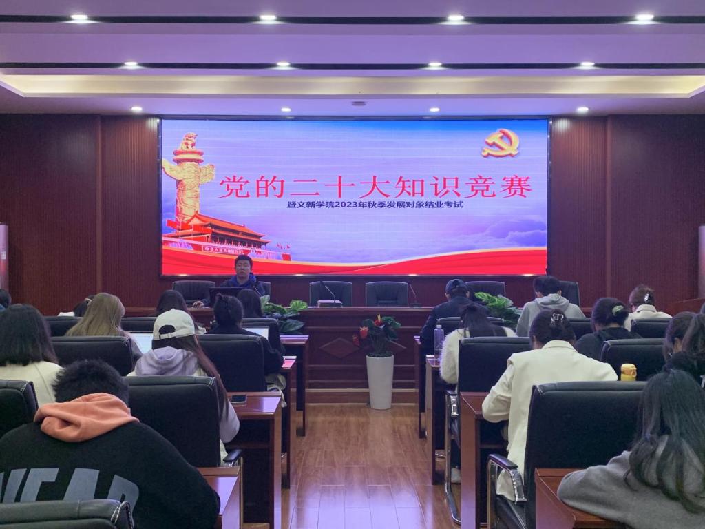 为深入落实并贯彻落实党的二十大精神,积极探索“互联网+党建”的新模式,进一步提升发展对象的理论知识能力水平,11月16日19时,“党的二十大知识竞赛暨文新学院2023年秋季发展对象结业考试”于william金盆岭校区九号教学楼218室成功举行。
