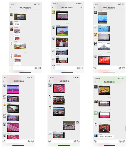 支部成员们在观看直播的同时,纷纷将照片发到支部微信群,营造出了大家一起共同收看的热烈气氛。中文教工支部成员17人全部参加了这次收看庆祝建党百年的活动。(/黄莹 /伍接朝)
