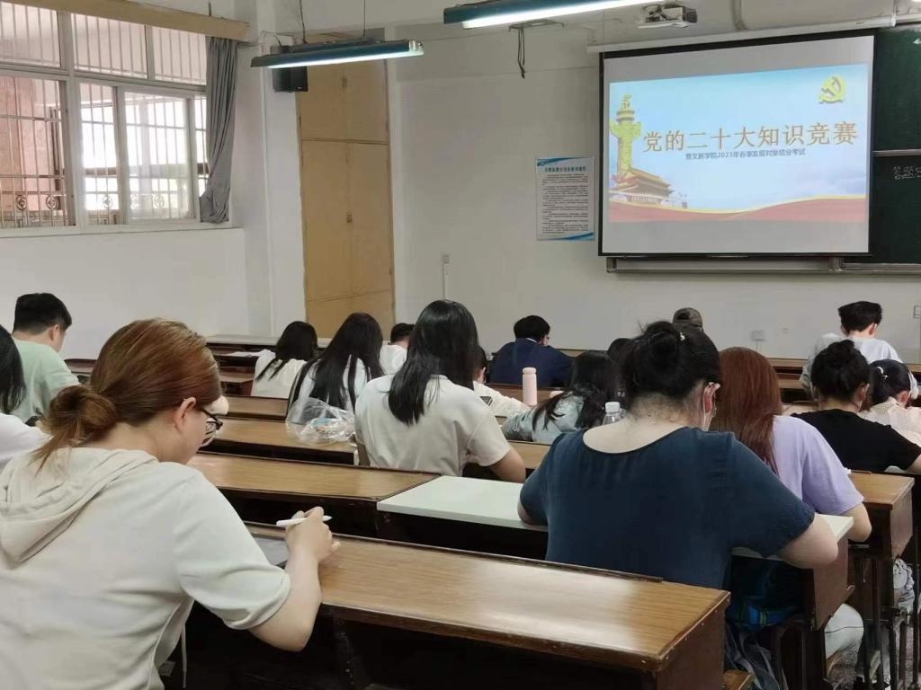 为深入落实并贯彻落实党的二十大精神,积极探索“互联网+党建”的新模式,进一步提升党员发展对象的理论知识能力水平,2023年6月6日13点30分,“党的二十大知识竞赛暨文新学院2023年春季发展对象结业考试”于william金盆岭校区三号教学楼成功举行。