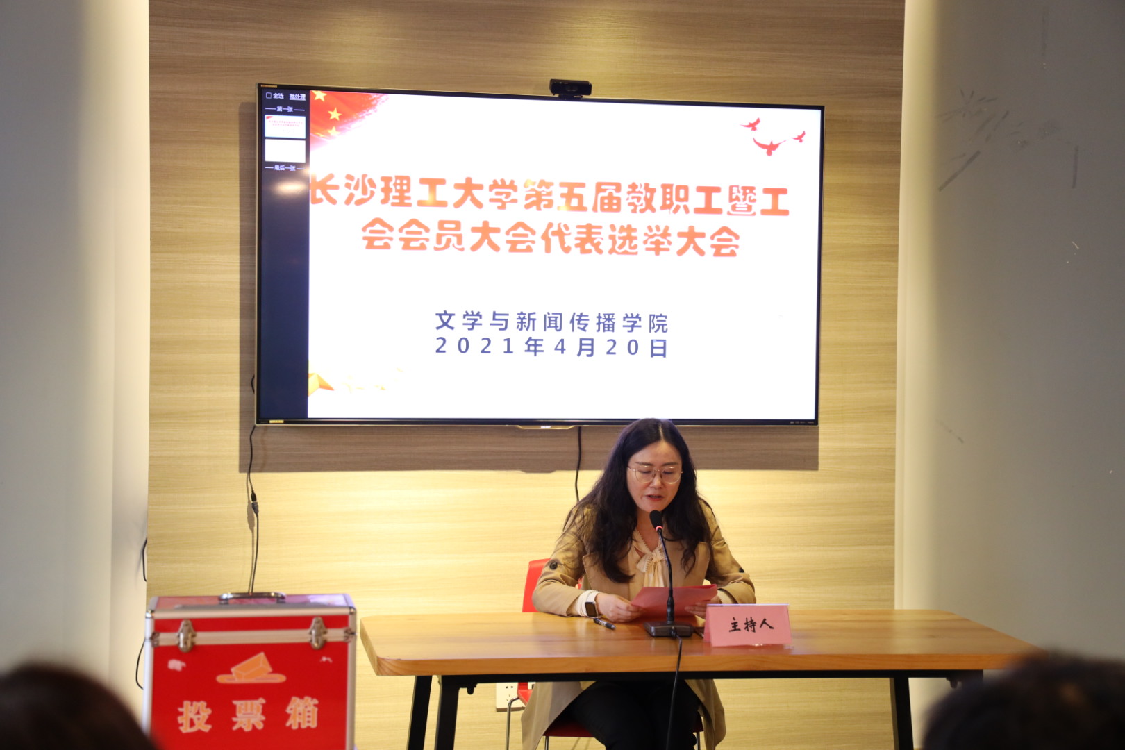 汤路对大会的主要任务做了说明,代表学院提出了大会选举工作监票人建议名单和计票人名单,对代表候选人酝酿、提名过程进行了说明;学工办主任楚艳鸽宣读了《“双代会”选举办法》(草案),介绍了候选人的基本情况。通过与会教职工的现场酝酿和举手表决,先后通过了《“双代会”选举办法》、代表候选人名单和监票人名单。