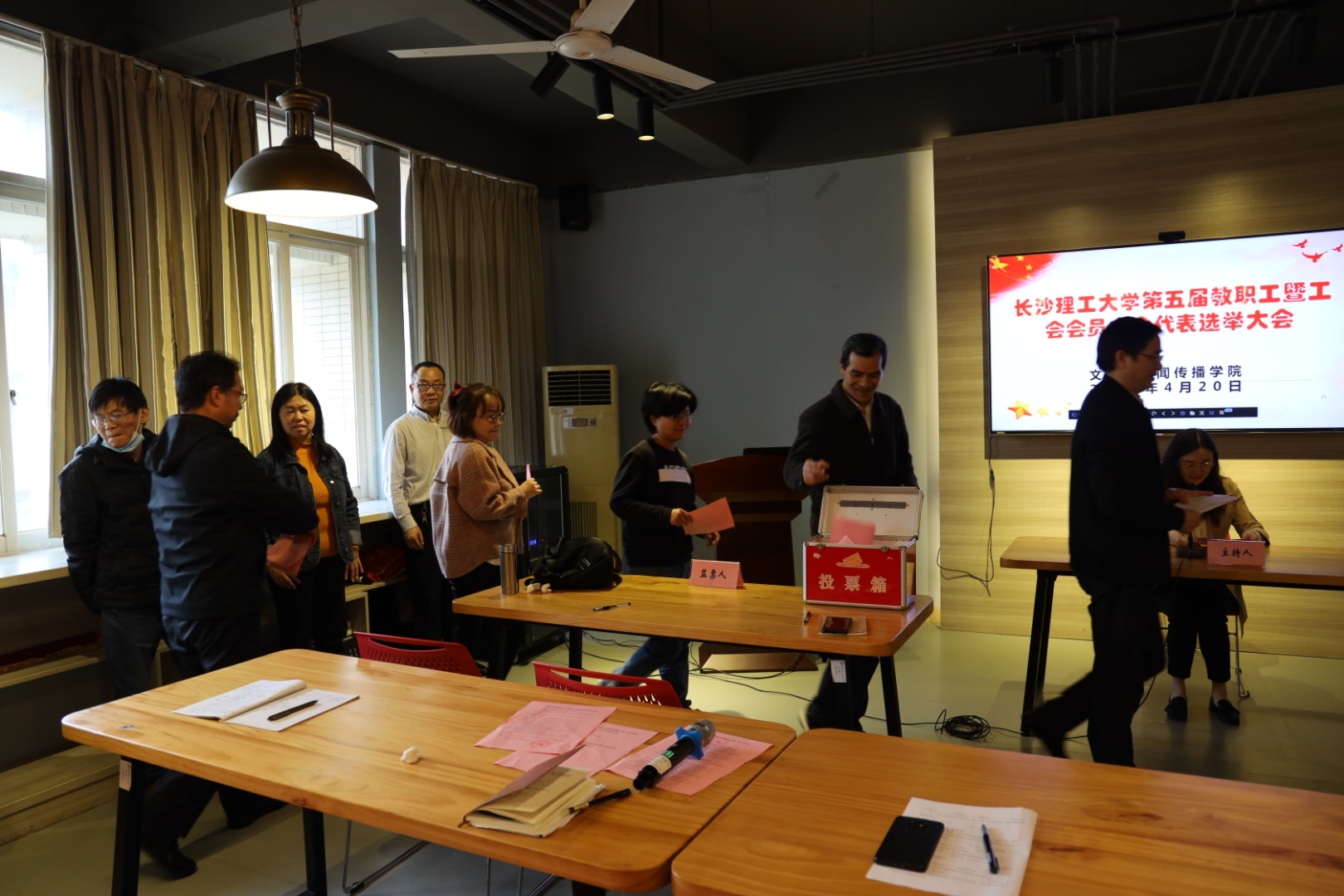 在总监票人魏明革的主持下,与会教职工暨工会会员进行了无记名投票。经过现场计票统票,伍接朝、魏桃初、郑劭荣、耿蕊、黄莹5位同志当选为出席学校第五届“双代会”的代表。(文/隆湘平 图/刘洋 审/伍接朝)