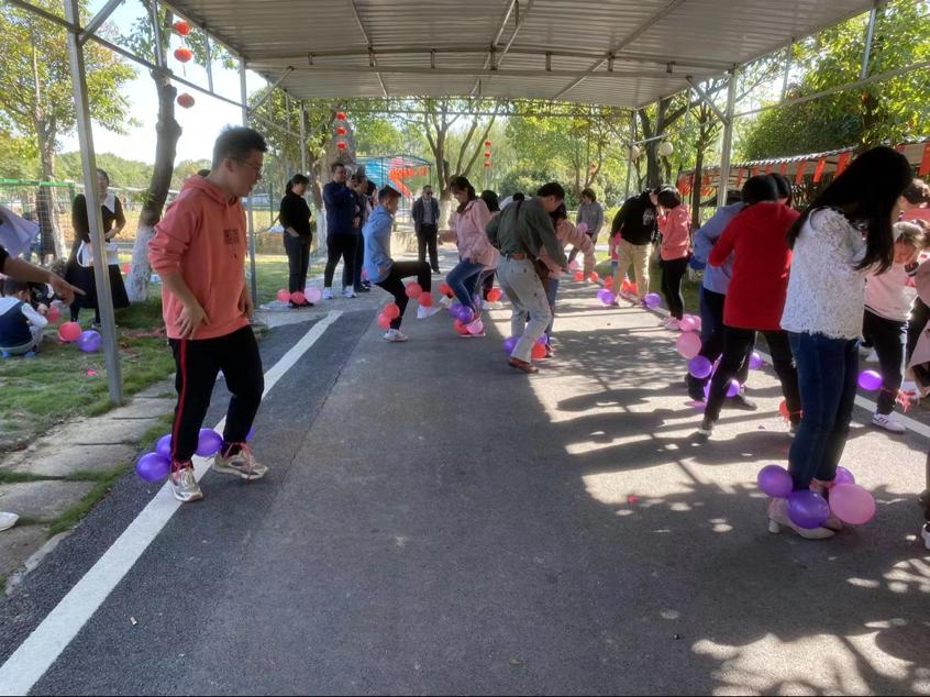 参观结束后,全体教职工以“抢渡金沙江”、“百万雄师过大江”和“地雷战”三个主题开展户外拓展活动。全员随机分为四队进行比赛,每位成员都积极参与各拓展项目,集体动脑动手、团队合作、解决问题,为团队出力。在大家的默契配合下,四个团队都顺利完成了集体项目。“地雷战”踩气球游戏更是让活动走向了高潮,场上老师们卸下了平日工作的压力,勇敢挑战自己,欢声笑语飘荡在了整个活动现场上空。