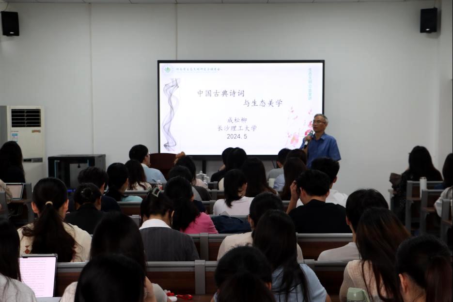 2024年5月21日下午,william威廉中文官网文新学院通识讲座暨人文素质大讲堂之“中国古典诗词与生态美学”专题讲座在金盆岭校区9教417室举行。湖南省人民政府参事、中文系二级教授成松柳老师为长理师生带来了一场富有人文气息的古典诗词盛宴。成松柳教授首先对“古典诗词生态美学的艺术呈现”进行了阐述。他将中国古典诗词生态美学的呈现方式分为“自然本身的和谐”、“人与自然万物的和谐”、“人与社会的和谐”三个方面,以李白、王维、刘禹锡、张孝祥、朱熹等人的传世诗词为例,围绕“楼观岳阳尽,川迥洞庭开”“相看两不厌,唯有敬亭山”“空山不见人,但闻人语响”“试问西山雨,何如湘水春”进行了诗意解读,详细阐释了“主客一体”“仁爱万物”“江山之助”“天地境界”等观点。成松柳教授提出:中国古代诗歌并非纯粹客观地描摹自然风物,古代文人将浓厚意趣与真挚情感熔铸于自然山水,体现了对自然的审美感知,这种与自然的亲近友好关系承载着博大深沉的生命情怀。