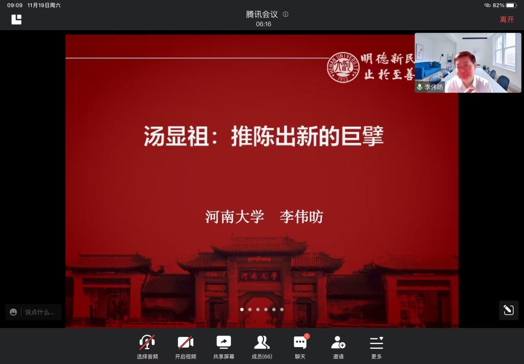 2022年11月19日上午9:00,河南大学李伟昉教授应邀为我院师生开展以“汤显祖:推陈出新的巨擎”为主题的讲座。此次讲座线上线下同步进行。文新学院党委委员郑劭荣教授担任讲座主持人,副院长周云鹏副教授、中文系周静副教授、黄宇副教授、向双霞老师、王莉老师等出席了本次讲座。22级中文研究生及22级汉语言文学本科生全体参与听讲。郑劭荣教授对李伟昉教授的到来表示热烈欢迎,并对其在国内比较文学方向取得的成绩表达了衷心的祝贺。