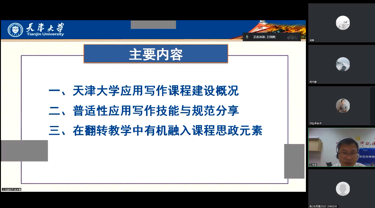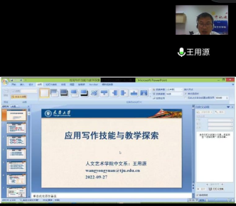 9月27日晚7点,天津大学人文艺术学院党委副书记、副院长王用源受邀为我院师生进行线上讲座指导,分享了多年来在“应用文写作”课程建设、课堂教学及改革的理论探索、实践经验。会议由文新学院副院长周云鹏主持,中文系副主任周静最后进行总结。院党委委员兼中文系主任郑劭荣教授及院内外三百余名师生参加。
