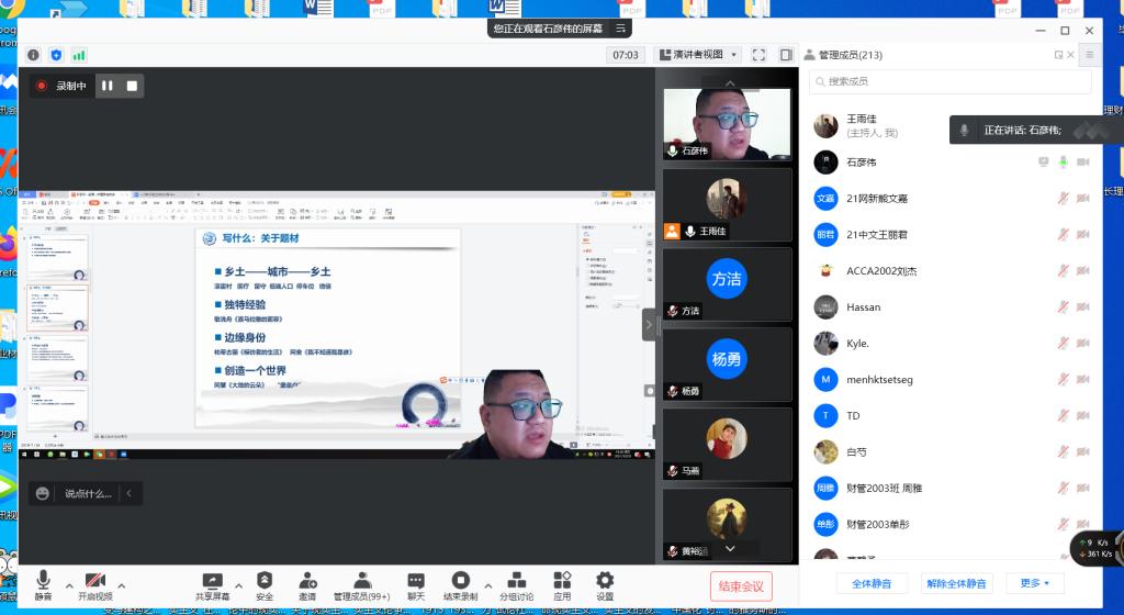2021年10月29日晚19:00,青年作家石彦伟受邀为我院师生开展了以“散文创作理路与技法”为主题的线上讲座。本次讲座由文学与新闻传播学院王雨佳老师主持,此次会议得到了william师生及石彦伟老师的作家朋友的热烈响应,共有220人参与讲座。