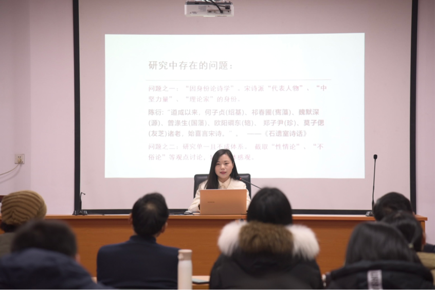 老师分享环节向双霞博士带我们走近何绍基这位诗人。向博士将何绍基浓郁的性灵诗学倾向在论诗诗句、诗学理论体系和诗歌评点中的体现为同学们娓娓道来。同时,她也对何绍基诗学和性灵诗学的异趣之处譬如性情的雅化、对考据的强调、诗歌评点重议论、重刻画摹写细腻等进行讲评。随后,各位评委老师对向博士学术分享进行点评讨论,肯定向博士选题的新颖,同时也对其未来学术研究提出相关建议。
