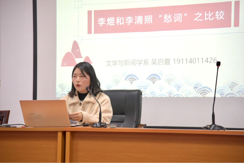 吴启夏同学将李煜与李清照的“愁词”放在一起比较。通过分析两位词人词中的“愁”字在其诗词中的运用,为同学们展现两位词人的“愁”,带同学们见证两位词人的心路历程和两位词人一生的遭遇。最后通过比较探究两人“愁词”形成的原因,并对其“愁词”进行比较,分析其在艺术特色上的异同。分享结束后,老师与同学就研究主题的选择及注意事项进行交流沟通。