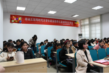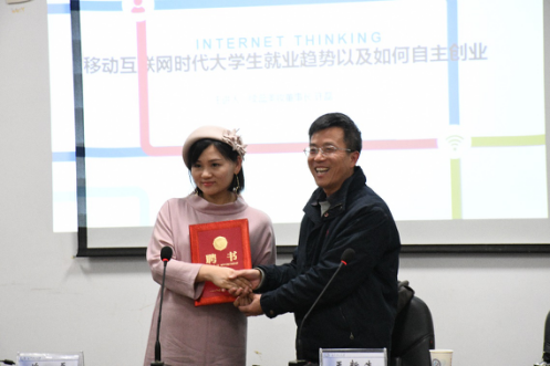 许磊女士针对大学生目前关心的就业趋势和自主创业等问题展开了细致入微的讲解,其回忆了在校求学的经历以及在各大城市之间辗转的创业经历,以最近“袁立手撕浙江卫视”热点新闻为导入,传达汉语言文学、新闻等人文学科能力的重要性和应用广泛性,帮助同学们树立强烈的专业自信。许磊女士指出,在移动互联网时代,就业岗位的涌现和淘汰速度越来越快,没有“铁饭碗”的存在,唯有保持永久的学习能力才能立于不败之地,在校大学生要有未雨绸缪的规划意识。讲座结束之后,许磊女士与在场学生进行了热烈的互动交流,针对同学们提出的各种问题,许磊女士也耐心地予以解答。因为其出色的创业经历和对学生的真诚的关心指导,许磊女士被聘为文法学院创业导师,由王新生院长颁发聘书。许磊女士会后宣传了其创办的续蕊美妆公司,鼓励有志加入移动美妆电商的同学前来应聘。