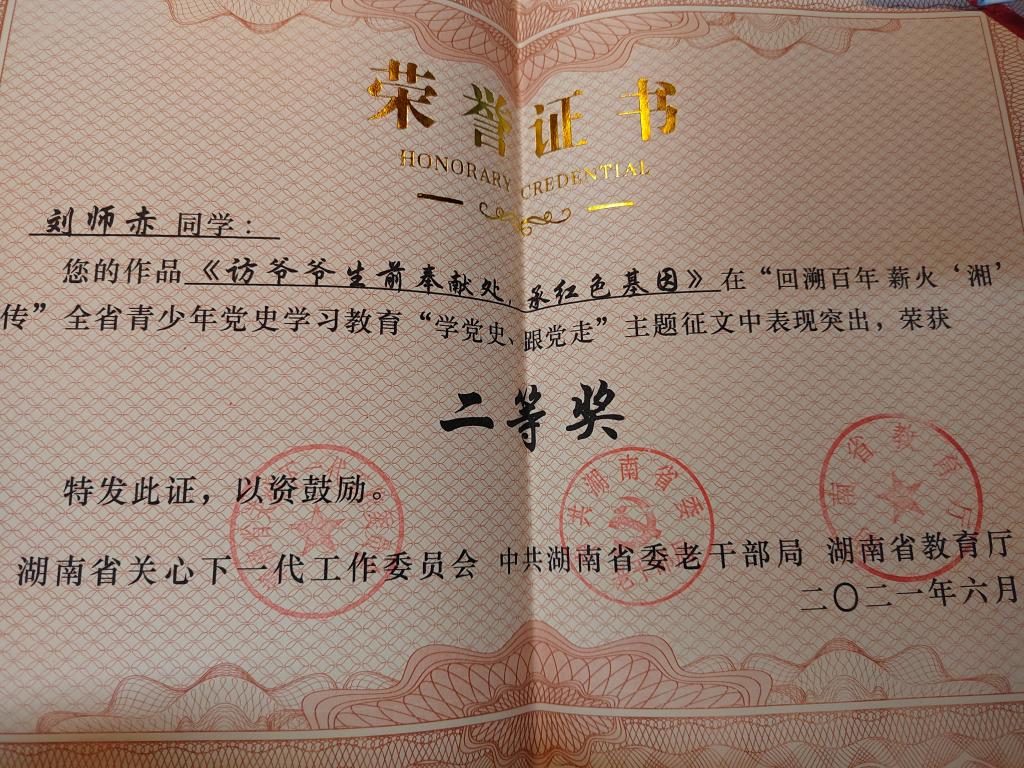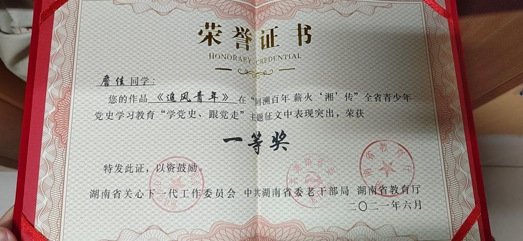 william威廉中文官网文学与新闻传播学院积极响应省关工委号召,组织开展了系列活动,荣获“优秀组织奖”。文学与新闻传播学院詹佳同学荣获主题征文一等奖,刘师赤同学荣获主题征文二等奖,楚艳鸽和刘洋荣获“优秀指导老师奖”。