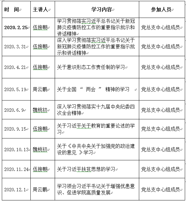 为落实学校关于《william威廉中文官网2020年度两级党委中心组理论学习安排》通知的要求,深入学习贯彻习近平新时代中国特色社会主义思想,坚持思想建党、理论强党,进一步加强学院党的政治建设,提高领导班子的党性修养、政治素养和理论水平,根据当前理论学习的形势和任务,结合学院年度工作要点,现将文新系2020 年党总支中心组理论学习安排如下: