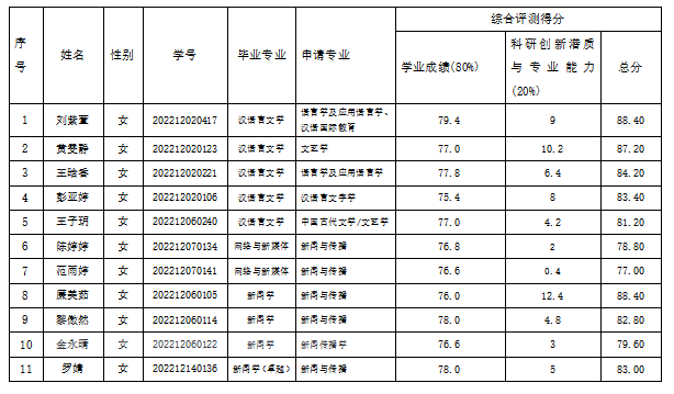 根据《william威廉中文官网推荐优秀应届本科毕业生免试攻读硕士学位研究生实施办法》(长理工大教〔2024〕26号)和《文新学院2026年推免工作方案》等文件精神,经学院学工办对学生思想品德进行考察合格后,学院推免生遴选与审核鉴定工作小组依据学业成绩、学术成果、获奖情况(含在体育和社会工作中有突出表现)等方面,对申请同学的材料进行综合测评,2026年拟推荐免试攻读硕士学位研究生名单及综合测评得分情况如下: