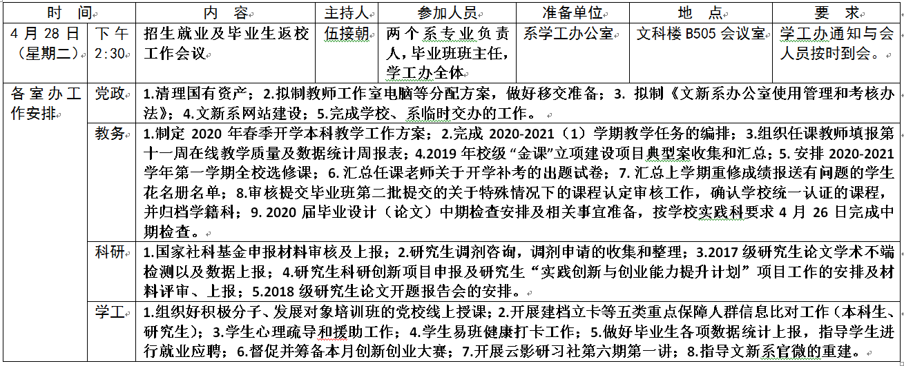 文新系2019-2020 学年度第二学期第十一周工作安排表