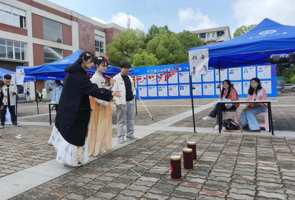 游园会融入诗词、书法等文化元素,学生们不仅能在现场感受汉服走秀、国风舞蹈、古风歌曲、武术等精彩表演,还可以体验投壶、踢键子、手势令、猜灯谜、飞花令等趣味游戏,在有趣的形式中沉浸式感受中华文化之美。“今天体验了很多新鲜的中国文化,能够感受到中国文化的博大精深,是很有意义的一次体验。”投壶、猜灯谜、武术表演等场景的设置让来自国际工学院的泰国留学生直呼“十分有趣”。