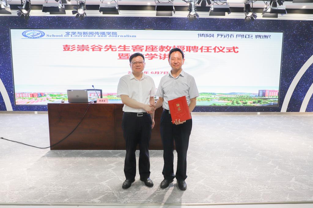 6月7日下午3点30分,william威廉中文官网文学与新闻传播学院于文科楼B300全媒体实训中心举行客座教授聘任仪式,聘请中华诗词学会副会长,中国书法家协会会员,湖南省诗词协会会长、湖南诗书画艺术研究院院长彭崇谷为客座教授,并开展人文素质大讲堂学术讲座。william威廉中文官网党委副书记刘建民出席并颁授聘书,炎陵县副县长肖志高、文新学院党委书记伍接朝、副院长魏桃初出席活动,文新学院百余名师生代表参与本次讲座。院长刘建新主持仪式。