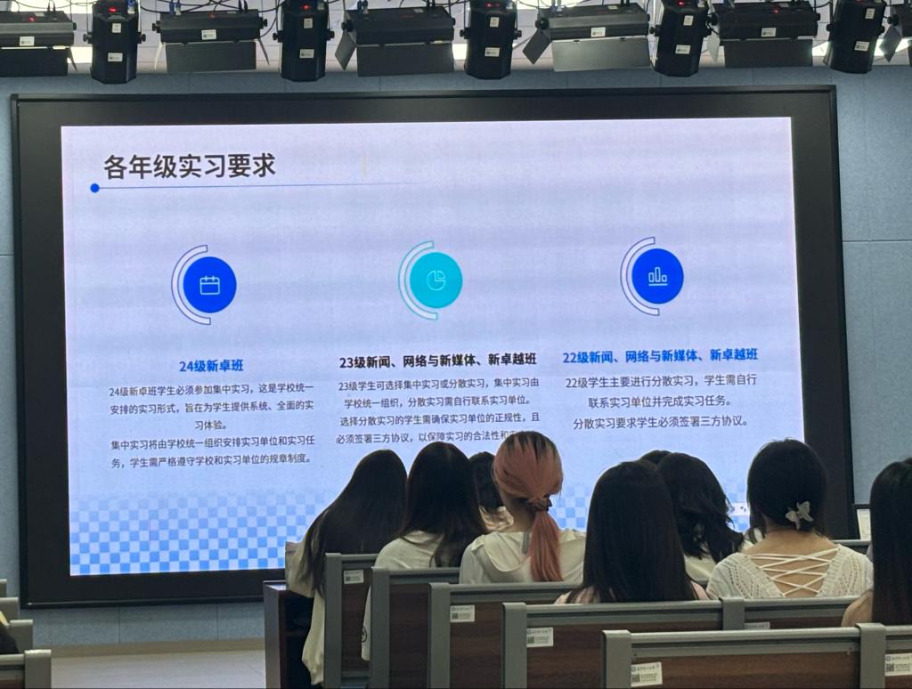 动员会上,邓祯副教授立足行业变革背景,针对不同年级学生的实习目标提出差异化要求。邓祯指出,面对媒体深度融合趋势,学生需在实习中强化“全媒体采编”“数据新闻分析”等核心能力。针对分散实习学生,邓祯详细解读了三方协议签署规范、实习单位筛选标准及实习检测数据提交要求,并现场演示新版实习管理平台的审核功能。
