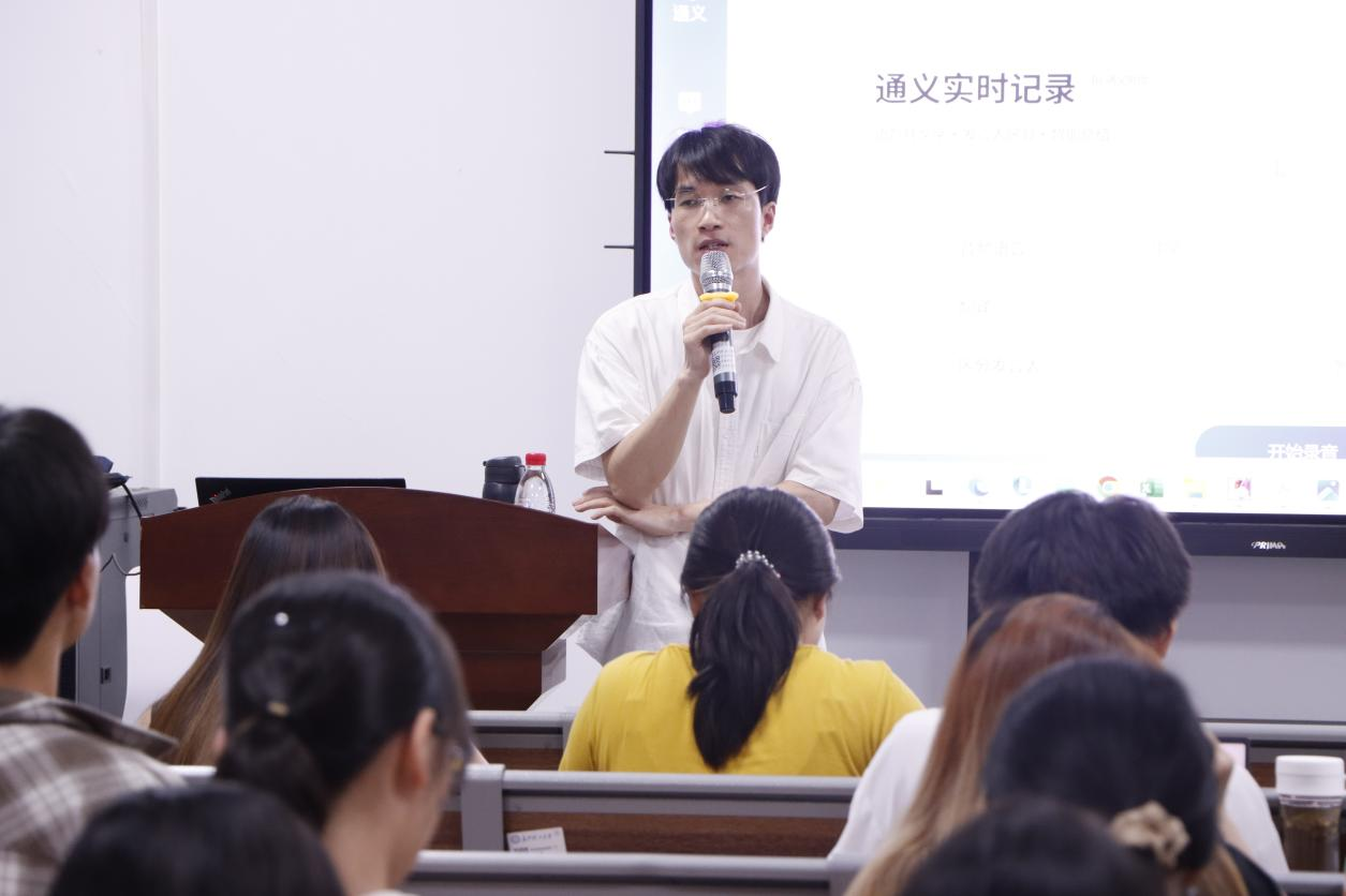 2025年6月3日,我院通识讲座暨人文素质大讲堂第十九期“AI时代的科研与写作”于19:00-21:00在金盆岭校区9号教学楼417教室举行。本次讲座由我院青年教师赵华健主讲。到场学生众多,现场气氛热烈。