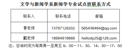 (3)符合报名条件的学生在9月6日前将报名表(word文档)以邮件附件形式发至新闻卓越试点班联系人邮箱565436464@qq.com,邮件主题为“姓名+卓越班申请表”。未在规定时间内以规定形式报名的将不予受理,报名表见附件1。