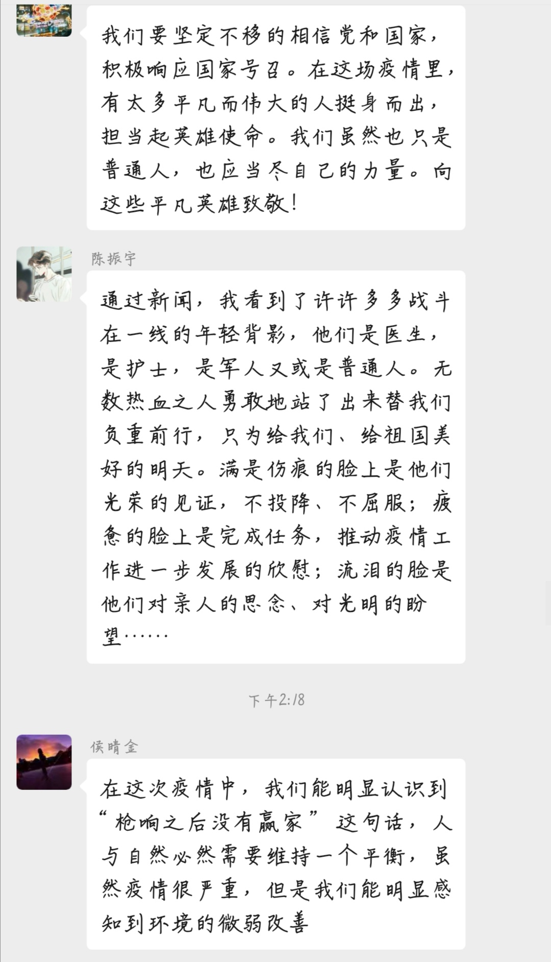 最后,就大学生在这次疫情中扮演什么样的角色、承担什么样的责任这些问题,大家在线讨论积极发言,听从党中央的统一指挥统一部署,杜绝粗陋的餐饮习惯,不吃野味等得到同学们的广泛认同。在举国上下万众一心,众志成城做好新冠肺炎疫情防控工作的特殊时刻,文新系学子要积极响应党中央和政府的号召,始终有着一定打赢疫情防控人民战争、总体战、阻击战的信心和决心,以防疫抗疫一线的感人故事为榜样,传承和弘扬爱国主义精神,胸怀大志、心有大我、肩负大义的时代召唤,不负韶华。