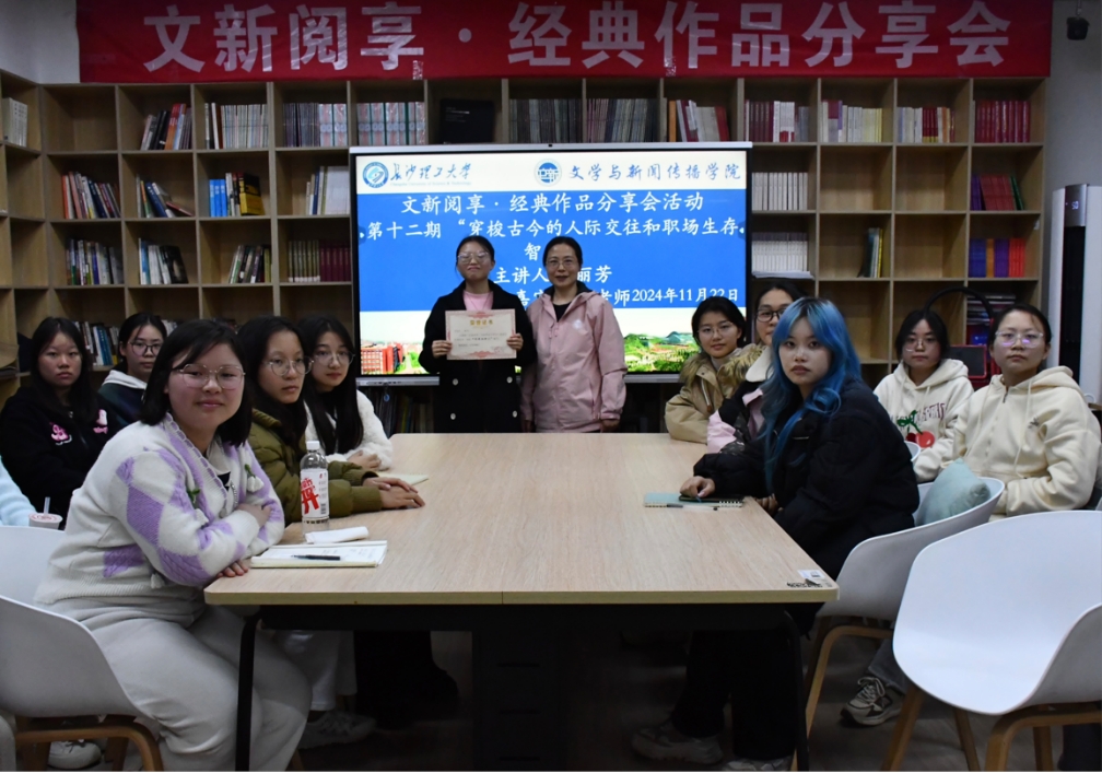 活动最后,曾真为贺丽芳颁发“优秀主讲人”证书,并与参与者合影留念。此次分享会为同学们提供了一个交流与思考的平台,有助于激发同学们对于经典作品的创新性思考,助力解决生活中的疑难问题。