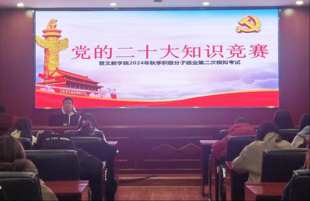 为贯彻落实党的二十大精神,积极探索“党建+互联网”新模式,进一步提升积极分子的理论知识水平,11月25日12时10分,“党的二十大知识竞赛暨文新学院2024年秋季积极分子第二次模拟考试”于william金盆岭校区九号教学楼218室成功举行。