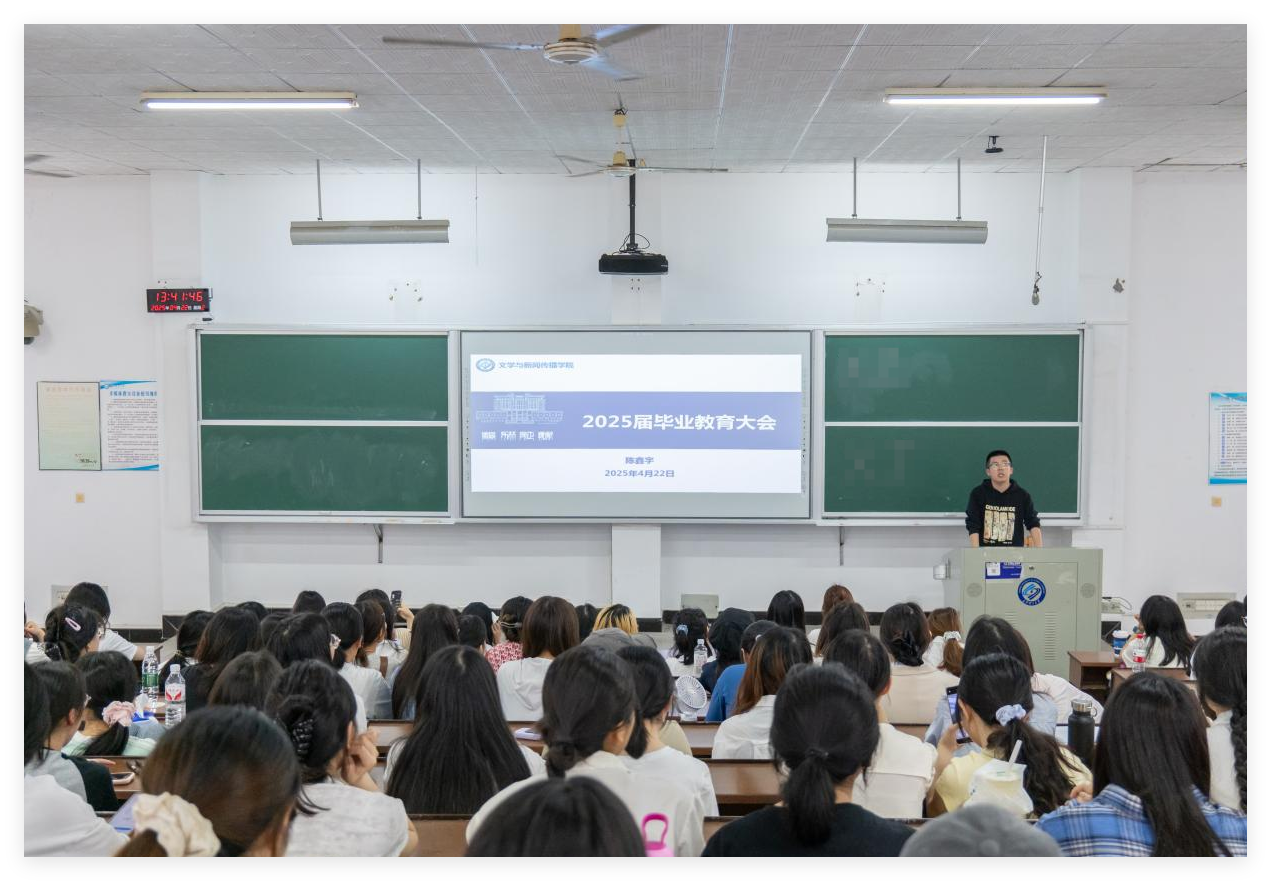 为落实立德树人根本任务,加强2025届本科毕业生思想政治教育,努力营造文明有序、积极向上、健康和谐的毕业氛围,2025年4月22日下午,文学与新闻传播学院在金盆岭校区12教600召开2025届本科毕业生毕业教育大会,辅导员陈鑫宇主持此次会议。